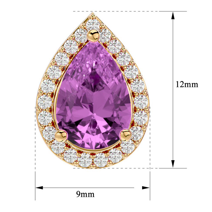 These elegant gemstone earrings feature two 9x6mm pear shape pink topaz gemstones at approximately 3 carats. They are surrounded by 48 sparkling diamonds in I-J color, I1-I2 clarity at 1/4 carat total weight. Total gem weight is approximately 3 1/4 carats. These earrings are in 14 karat yellow gold and have comfortable and secure friction backs.