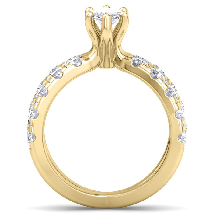 This diamond engagement ring features a 1 carat marquise shape center diamond and 22 3mm diamonds in H-I color, SI2-I1 clarity. Total carat weight is approximately 3 1/5 carat. This ring is in 14 karat yellow gold.