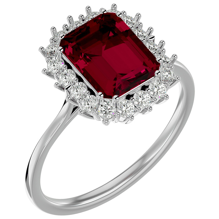 This stunning gemstone and diamond ring features one 9x7mm emerald cut ruby gemstone at 2.90 carats. It is surrounded by 18 sparkling diamonds in I-J color, I1-I2 clarity at 1/3 carat. Total gem weight is approximately 3 1/5 carats. This ring is crafted in 14 karat white gold.