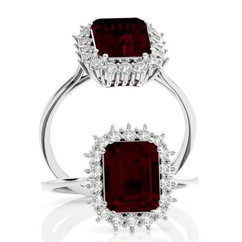 This stunning gemstone and diamond ring features one 9x7mm emerald cut ruby gemstone at 2.90 carats. It is surrounded by 18 sparkling diamonds in I-J color, I1-I2 clarity at 1/3 carat. Total gem weight is approximately 3 1/5 carats. This ring is crafted in 14 karat white gold.