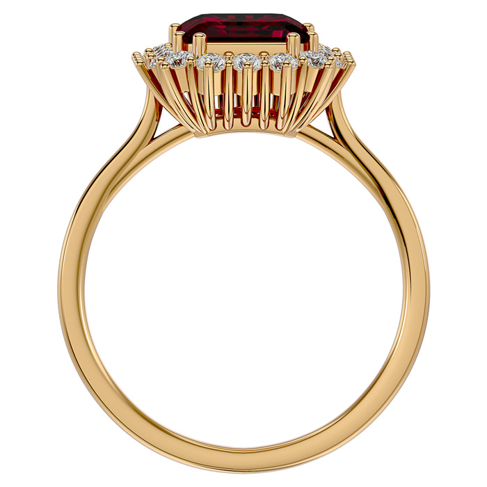 This stunning gemstone and diamond ring features one 9x7mm emerald cut ruby gemstone at 2.90 carats. It is surrounded by 18 sparkling diamonds in I-J color, I1-I2 clarity at 1/3 carat. Total gem weight is approximately 3 1/5 carats. This ring is crafted in 14 karat yellow gold. *Retrograde Birthstones™ flips the idea of traditional birthstones. Wear your ½ birthday birthstone, your Retrograde Birthstone, “The Birthstone For Your Bad Side™.