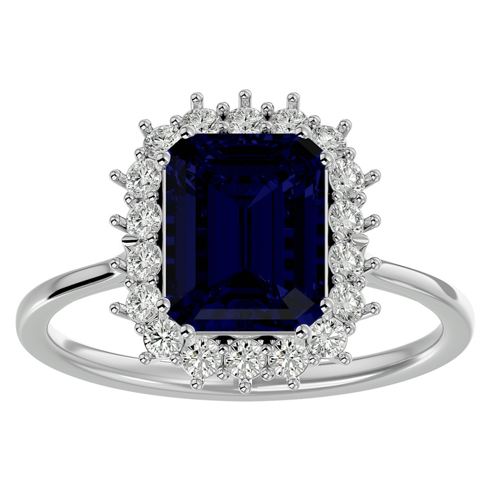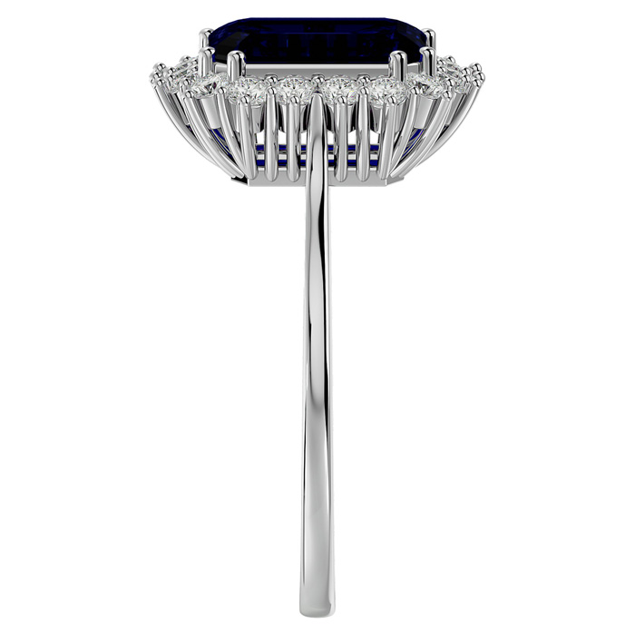 This stunning gemstone and diamond ring features one 9x7mm emerald cut sapphire gemstone at 2.95 carats. It is surrounded by 18 sparkling diamonds in I-J color, I1-I2 clarity at 1/3 carat. Total gem weight is approximately 3 1/5 carats. This ring is crafted in 14 karat white gold.