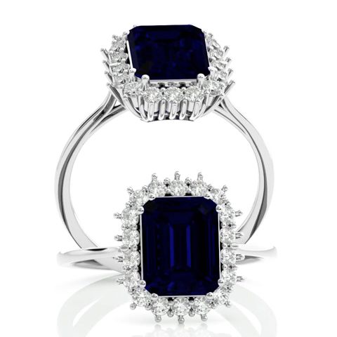 This stunning gemstone and diamond ring features one 9x7mm emerald cut sapphire gemstone at 2.95 carats. It is surrounded by 18 sparkling diamonds in I-J color, I1-I2 clarity at 1/3 carat. Total gem weight is approximately 3 1/5 carats. This ring is crafted in 14 karat white gold.