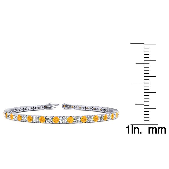 This classic gemstone bracelet features shimmering white diamonds in J-K color, I1-I2 clarity and citrine gemstones. The 6 inch bracelet contains 57 gemstones and diamonds at 2.56 carats. The 6.5 inch bracelet contains 62 gemstones and diamonds at 2.79 carats. The 7 inch bracelet contains 67 gemstones and diamonds at 3.01 carats. The 7.5 inch bracelet contains 72 gemstones and diamonds at 3.24 carats. The 8 inch bracelet contains 76 gemstones and diamonds at 3.42 carats. The 8.5 inch bracelet contains 81 gemstones and diamonds at 3.64 carats. The 9 inch bracelet contains 86 gemstones and diamonds at 3.87 carats. This bracelet is approximately 2.25mm wide and is crafted in 14 karat white gold. This bracelet has a secure, box with tongue and safety clasp.