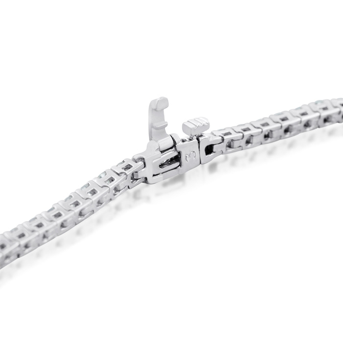 This 3 1/2 carat diamond tennis bracelet features approximately 77 round-cut natural diamonds to create a stunning, shimmering effect. The stones are set in solid 14 karat white gold. A secure, hidden-safety clasp keeps this piece fastened. Diamond color is J-K, diamond clarity is I2. Total carat weight varies by wrist length, but is approximately 3 carats.