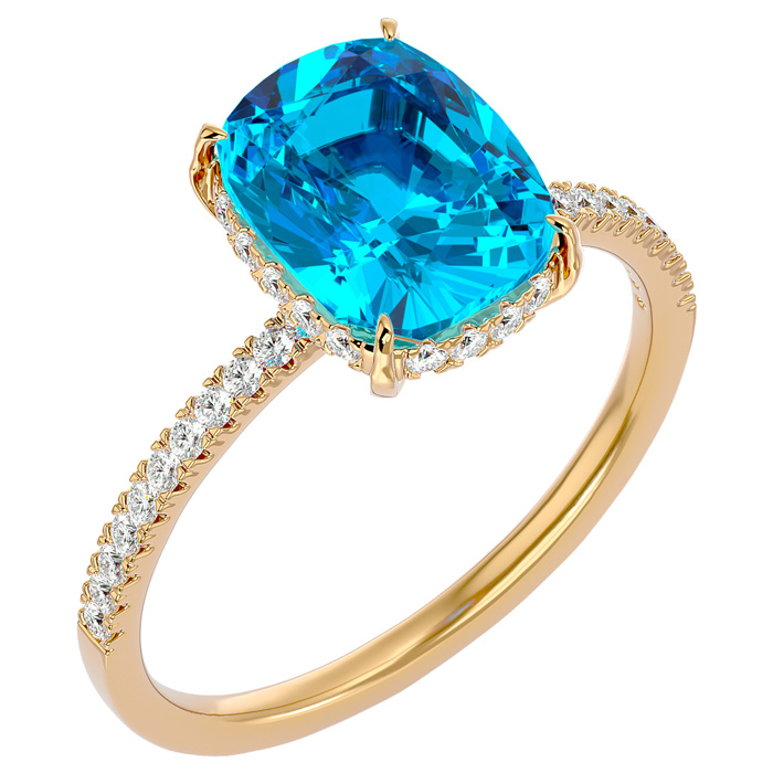 3 3/4 Carat Antique Cushion Shape Blue Topaz and Hidden Halo Diamond Ring In 14 Karat Yellow Gold