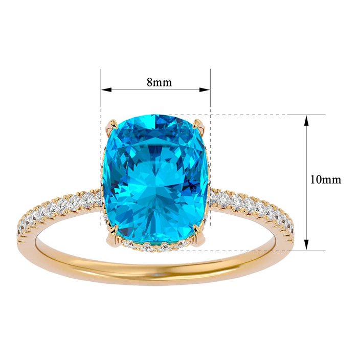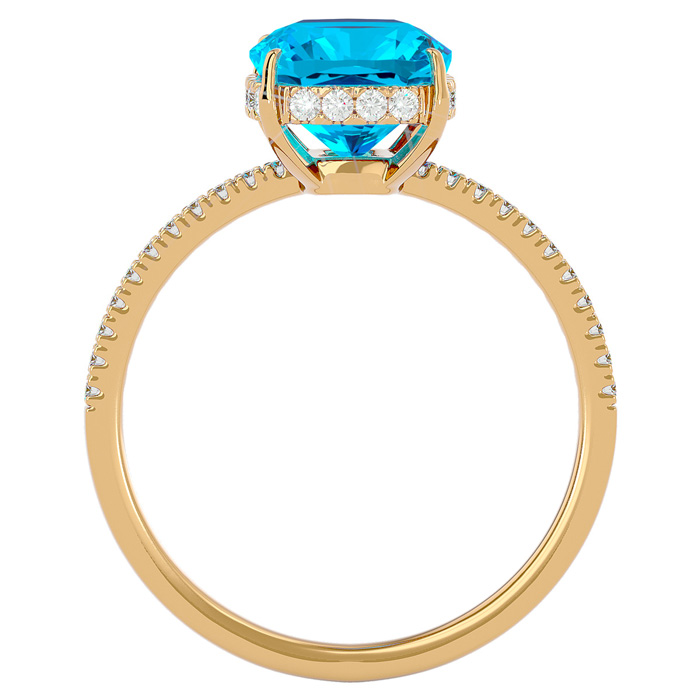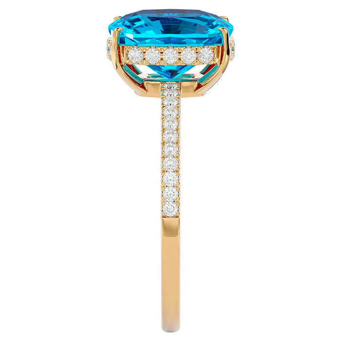 This elegant gemstone ring features one 10x8mm antique cushion shape blue topaz gemstone at approximately 3 1/2 carats. It is surrounded by 32 sparkling diamonds in I-J color, I1-I2 clarity at 1/4 carat total weight. Total gem weight is approximately 3 3/4 carats. This ring is in 14 karat yellow gold.
