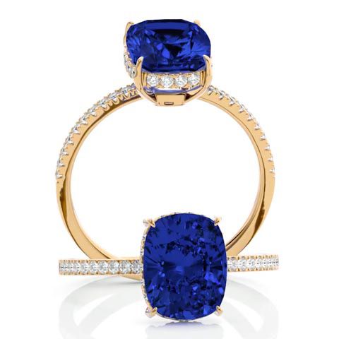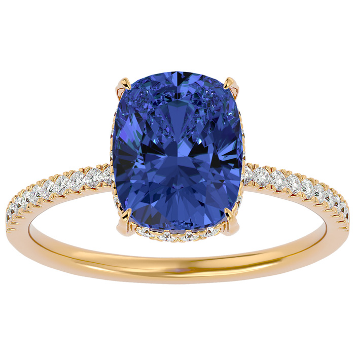 3 3/4 Carat Antique Cushion Shape Tanzanite and Hidden Halo Diamond Ring In 14 Karat Yellow Gold