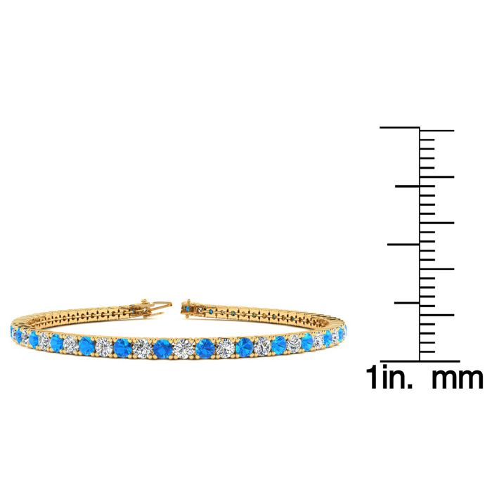 This classic gemstone bracelet features shimmering white diamonds in J-K color, I1-I2 clarity and blue topaz gemstones. The 6 inch bracelet contains 57 gemstones and diamonds at 2.84 carats. The 6.5 inch bracelet contains 62 gemstones and diamonds at 3.10 carats. The 7 inch bracelet contains 67 gemstones and diamonds at 3.34 carats. The 7.5 inch bracelet contains 72 gemstones and diamonds at 3.60 carats. The 8 inch bracelet contains 76 gemstones and diamonds at 3.80 carats. The 8.5 inch bracelet contains 81 gemstones and diamonds at 4.04 carats. The 9 inch bracelet contains 86 gemstones and diamonds at 4.30 carats. This bracelet is approximately 2.25mm wide and is crafted in 14 karat yellow gold. This bracelet has a secure, box with tongue and safety clasp.