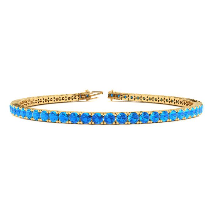 This classic gemstone bracelet features shimmering blue topaz gemstones. The 6 inch bracelet contains 57 gemstones at 3.42 carats. The 6.5 inch bracelet contains 62 gemstones at 3.72 carats. The 7 inch bracelet contains 67 gemstones at 4.02 carats. The 7.5 inch bracelet contains 72 gemstones at 4.32 carats. The 8 inch bracelet contains 76 gemstones at 4.56 carats. The 8.5 inch bracelet contains 81 gemstones at 4.86 carats. The 9 inch bracelet contains 86 gemstones at 5.16 carats. This bracelet is approximately 2.25mm wide and is crafted in 14 karat yellow gold. This bracelet has a secure, box with tongue and safety clasp.