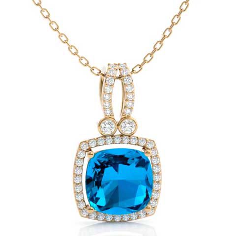 This elegant gemstone necklace features one 9mm cushion shape blue topaz gemstone weighing approximately 3 1/2 carats. It is surrounded by 48 sparkling diamonds in I-J color, I1-I2 clarity at 0.15 carats. Total gem weight is approximately 3 3/4 carats. This necklace is in 14 karat yellow gold and comes with an 18 inch chain with a spring-ring clasp.