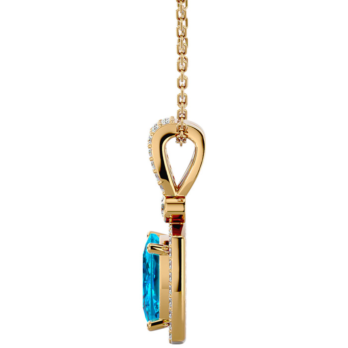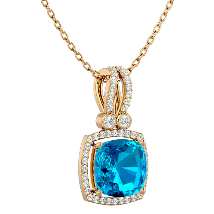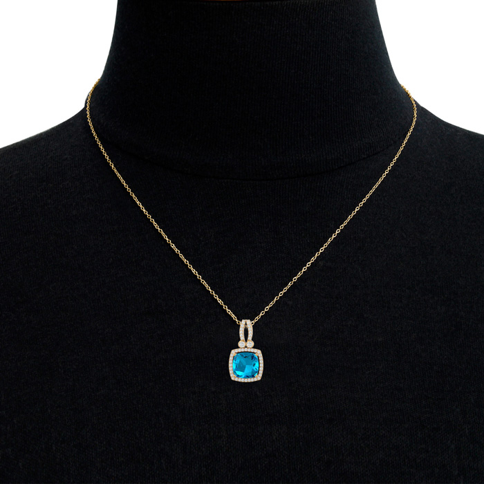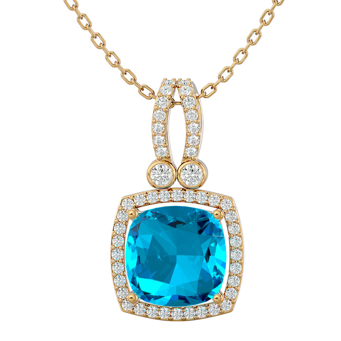 This elegant gemstone necklace features one 9mm cushion shape blue topaz gemstone weighing approximately 3 1/2 carats. It is surrounded by 48 sparkling diamonds in I-J color, I1-I2 clarity at 0.15 carats. Total gem weight is approximately 3 3/4 carats. This necklace is in 14 karat yellow gold and comes with an 18 inch chain with a spring-ring clasp.