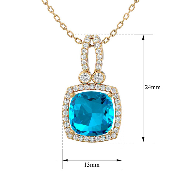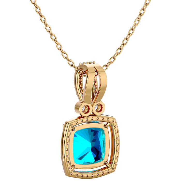 3 3/4 Carat Cushion Cut Blue Topaz and Halo Diamond Necklace In 14 Karat Yellow Gold, 18 Inches