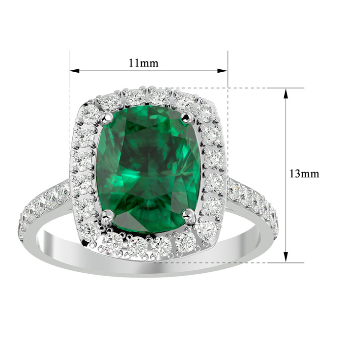 This rare gemstone and halo diamond ring features one 10x8mm cushion cut elongated emerald gemstone at 3.20 carats. It is surrounded by 34 sparkling diamonds in a halo and down the band in I-J color, SI2-I1 clarity at 0.61 carats. Total gem weight is approximately 3.81 carats. This ring is crafted in 18 karat white gold.