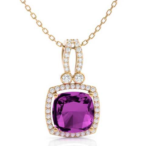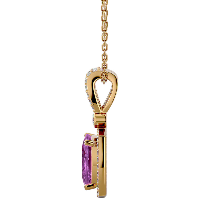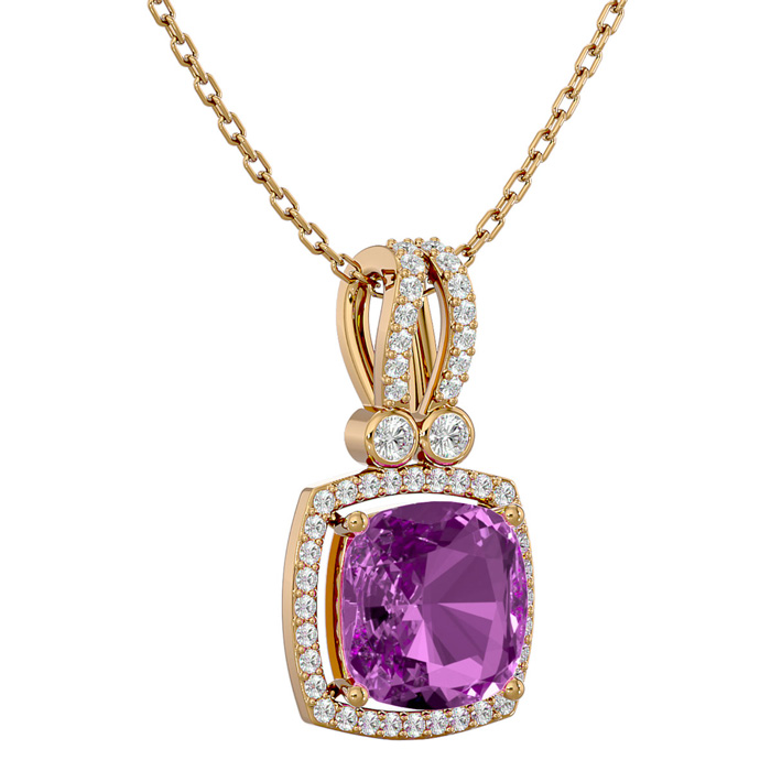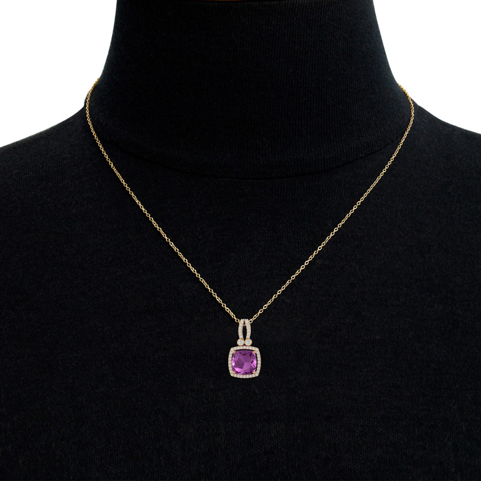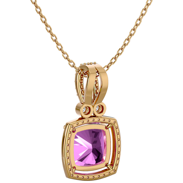 3 3/4 Carat Cushion Cut Pink Topaz and Halo Diamond Necklace In 14 Karat Yellow Gold, 18 Inches