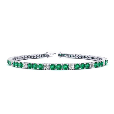 This classic gemstone bracelet features shimmering white diamonds in J-K color, I1-I2 clarity and emerald gemstones. The 6 inch bracelet contains 57 gemstones and diamonds at 3.14 carats. The 6.5 inch bracelet contains 62 gemstones and diamonds at 3.42 carats. The 7 inch bracelet contains 67 gemstones and diamonds at 3.70 carats. The 7.5 inch bracelet contains 72 gemstones and diamonds at 3.96 carats. The 8 inch bracelet contains 76 gemstones and diamonds at 4.18 carats. The 8.5 inch bracelet contains 81 gemstones and diamonds at 4.46 carats. The 9 inch bracelet contains 86 gemstones and diamonds at 4.74 carats. This bracelet is approximately 2.25mm wide and is crafted in 14 karat white gold. This bracelet has a secure, box with tongue and safety clasp.