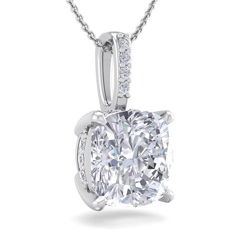 This elegant diamond necklace features one 6mm cushion cut diamond at approximately 3/4 carat. It is accented with 15 sparkling diamonds in H-I color, SI2-I1 clarity at 0.04 carats total. This necklace is in 14 karat white gold. This necklace comes with an 18 inch cable chain with a spring-ring clasp.