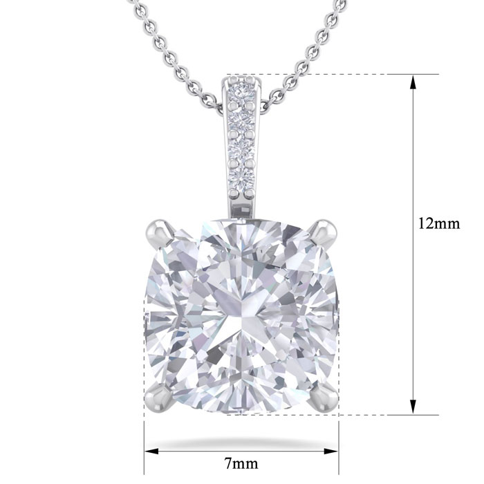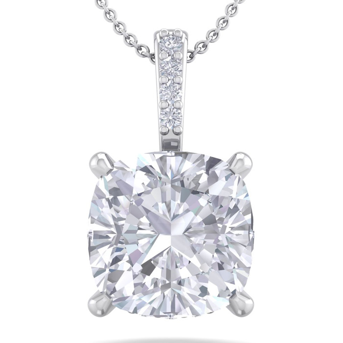 This elegant diamond necklace features one 6mm cushion cut clarity enhanced diamond at approximately 3/4 carat. It is accented with 15 sparkling diamonds in I-J color, I1-I2 clarity at 0.04 carats total. This necklace is in 14 karat white gold. This necklace comes with an 18 inch cable chain with a spring-ring clasp.