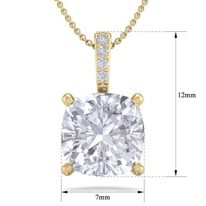 This elegant diamond necklace features one 6mm cushion cut diamond at approximately 3/4 carat. It is accented with 15 sparkling diamonds in H-I color, SI2-I1 clarity at 0.04 carats total. This necklace is in 14 karat yellow gold. This necklace comes with an 18 inch cable chain with a spring-ring clasp.