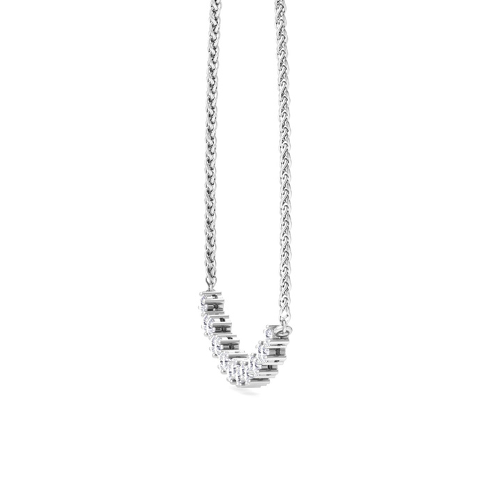 This fabulous diamond necklace features 17 sparkling round shape diamonds in H-I color, SI2-I1 clarity. Total carat weight is 3/4 carat. This necklace is in 14 karat white gold and comes with an 18 inch wheat chain with a lobster-claw clasp.