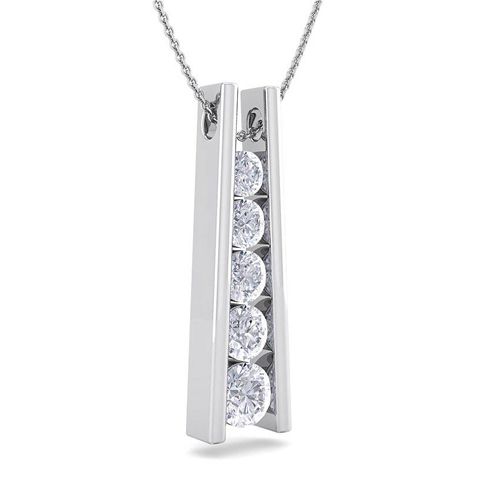 This elegant diamond necklace features 5 sparkling graduated diamonds in I-J color, I1-I2 clarity at 3/4 carat total weight. This necklace is in 14 karat white gold. This necklace comes with an 18 inch cable chain with a spring-ring clasp.