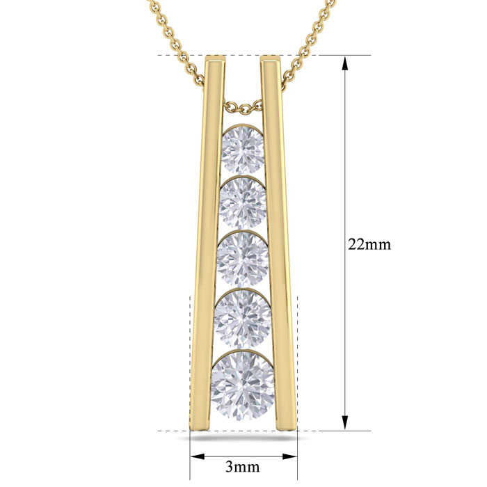 This elegant diamond necklace features 5 sparkling graduated diamonds in I-J color, I1-I2 clarity at 3/4 carat total weight. This necklace is in 14 karat yellow gold. This necklace comes with an 18 inch cable chain with a spring-ring clasp.