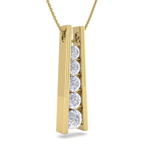 This elegant diamond necklace features 5 sparkling graduated diamonds in I-J color, I1-I2 clarity at 3/4 carat total weight. This necklace is in 14 karat yellow gold. This necklace comes with an 18 inch cable chain with a spring-ring clasp.