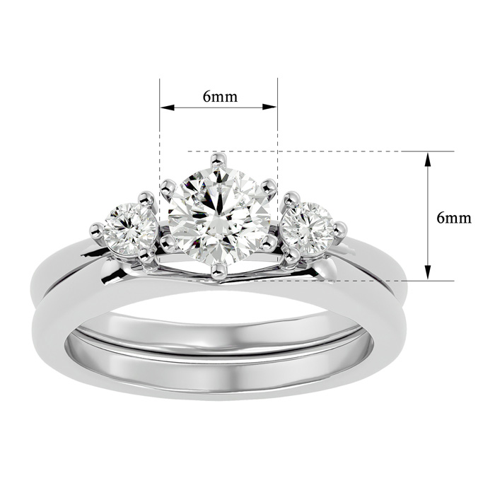 This fabulous diamond bridal set features a sparkling 3/4 carat round shape center diamond in H-I color, SI2-I1 clarity. It is surrounded by two side diamonds in the ring enhancer totaling 1/5 carat. Total carat weight is 1 carat. This ring is in 14 karat white gold.