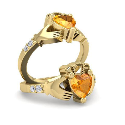 3/4 Carat Heart Shape Citrine and Diamond Claddagh Ring In 14 Karat Yellow Gold
