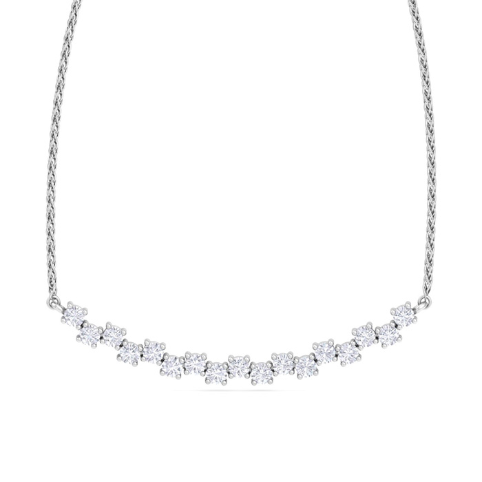 This fabulous diamond necklace features 17 sparkling round shape lab grown diamonds in G-H color, VS clarity. Total carat weight is 3/4 carat. This necklace is in 14 karat white gold and comes with an 18 inch wheat chain with a lobster-claw clasp.