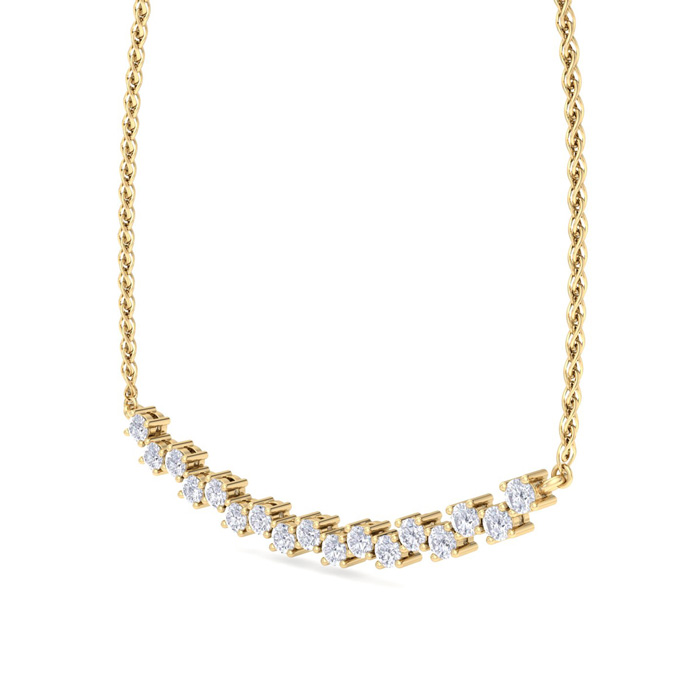 This fabulous diamond necklace features 17 sparkling round shape lab grown diamonds in G-H color, VS clarity. Total carat weight is 3/4 carat. This necklace is in 14 karat yellow gold and comes with an 18 inch wheat chain with a lobster-claw clasp.