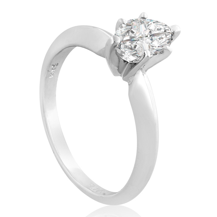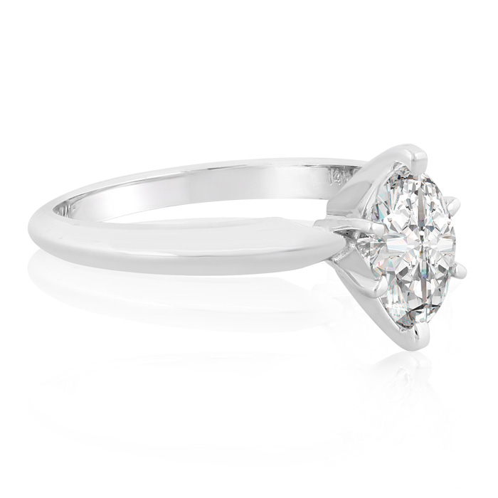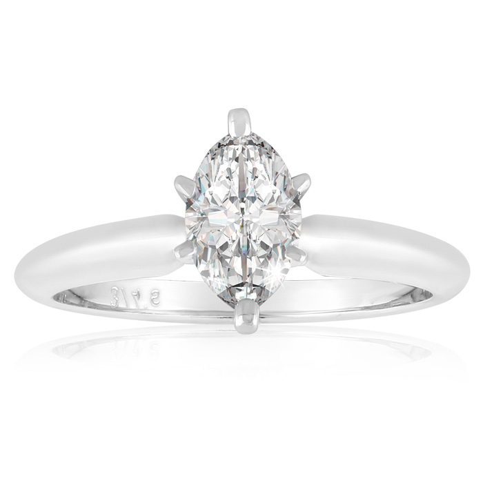 This classic solitaire ring features a 3/4 carat marquise shape diamond in H-I color, SI2-I1 clarity. This ring is in 14 karat white gold.