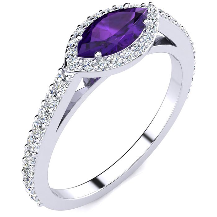 3/4 Carat Marquise Shape Amethyst and Halo Diamond Ring In 14 Karat White Gold