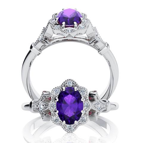 This stunning gemstone and halo diamond vintage ring features one 7x5mm oval shape amethyst gemstone at 0.70 carats. It is surrounded by 10 sparkling diamonds in a halo and down the band in H-I color, I1-I2 clarity at 0.13 carats. Total gem weight is 0.83 carats. This ring is crafted in 14 karat white gold.