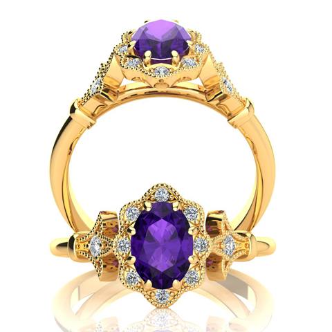 This stunning gemstone and halo diamond vintage ring features one 7x5mm oval shape amethyst gemstone at 0.70 carats. It is surrounded by 10 sparkling diamonds in a halo and down the band in H-I color, I1-I2 clarity at 0.13 carats. Total gem weight is 0.83 carats. This ring is crafted in 14 karat yellow gold.