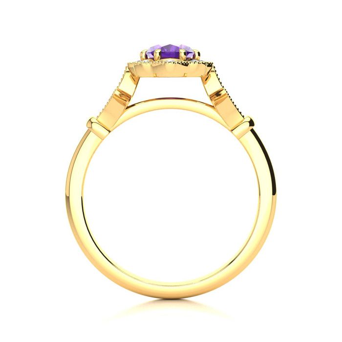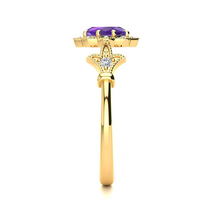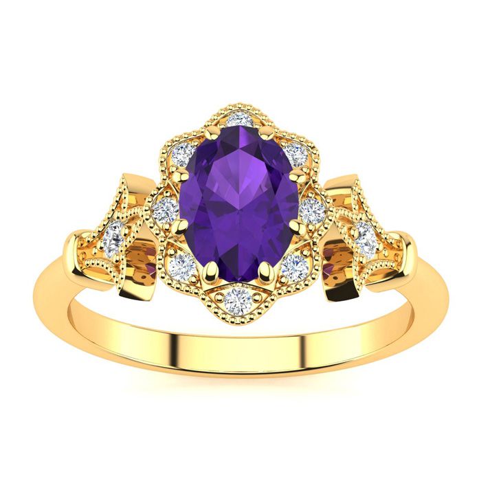 Retrograde Birthstones™ 3/4 Carat Oval Shape Amethyst and Halo Diamond Vintage Ring In 14 Karat Yellow Gold