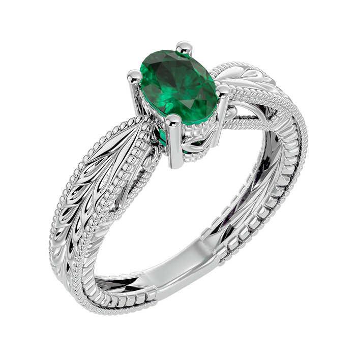 3/4 Carat Oval Shape Emerald Ring With Tapered Etched Band In 14 Karat White Gold