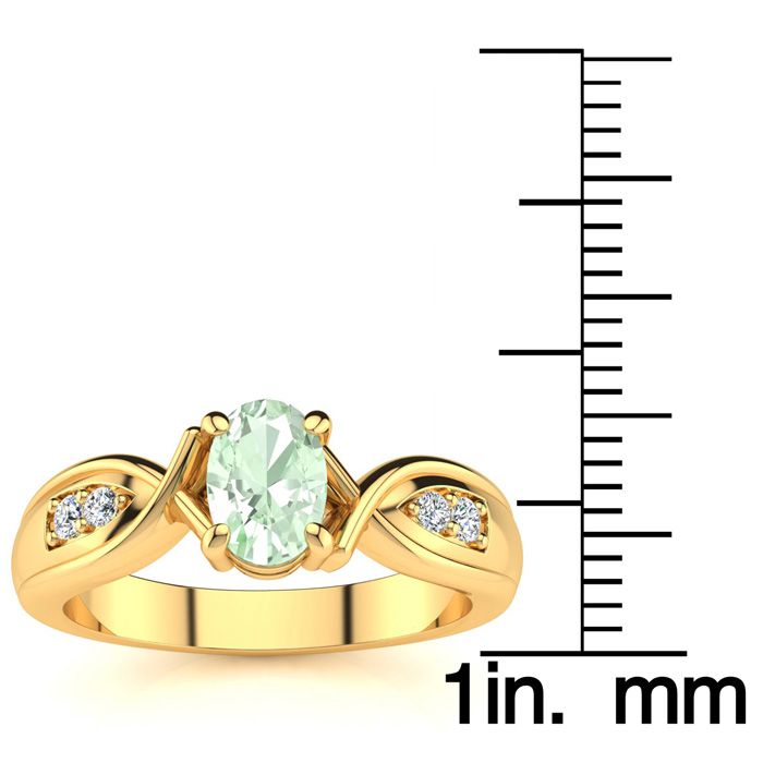 This stunning gemstone and diamond ring features one 7x5mm oval shape green amethyst gemstone at 0.70 carats. It is surrounded by 2 sparkling diamonds in I-J color, I1-I2 clarity at 0.04 carats. Total gem weight is 3/4 carats. This ring is crafted in 10 karat yellow gold.