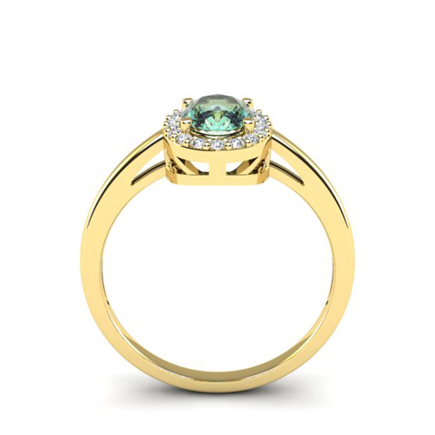 This stunning gemstone and halo diamond ring features one 7x5mm oval shape green amethyst gemstone at 0.70 carats. It is surrounded by 18 sparkling diamonds in a halo in I-J color, I1-I2 clarity at 0.09 carats. Total gem weight is 0.79 carats. This ring is crafted in 14 karat yellow gold.
