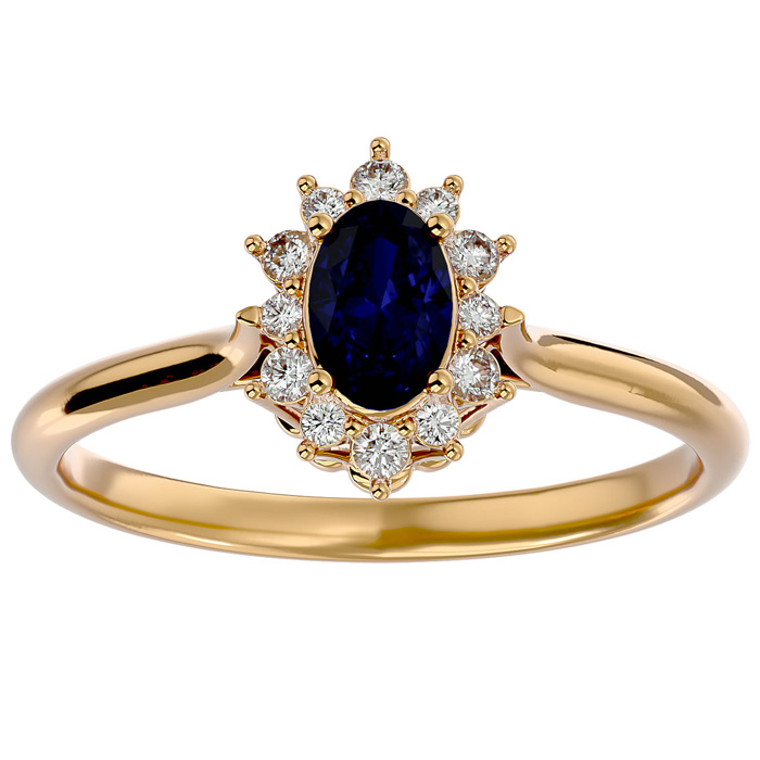 This elegant gemstone ring features one 6x4mm oval shape sapphire gemstone at approximately 0.60 carats. It is surrounded by 12 sparkling diamonds in I-J color, I1-I2 clarity at 0.15 carat total weight. Total gem weight is approximately 3/4 carats. This ring is in 14 karat yellow gold.