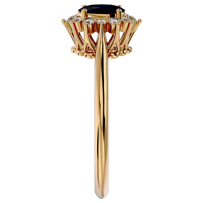 This Estate Jewelry ring features one 6x4mm oval shape sapphire gemstone at approximately 0.60 carats. It is surrounded by 12 sparkling diamonds in I-J color, I1-I2 clarity at 0.15 carat total weight. Total gem weight is approximately 3/4 carats. This ring is in 14 karat yellow gold and in size 6.