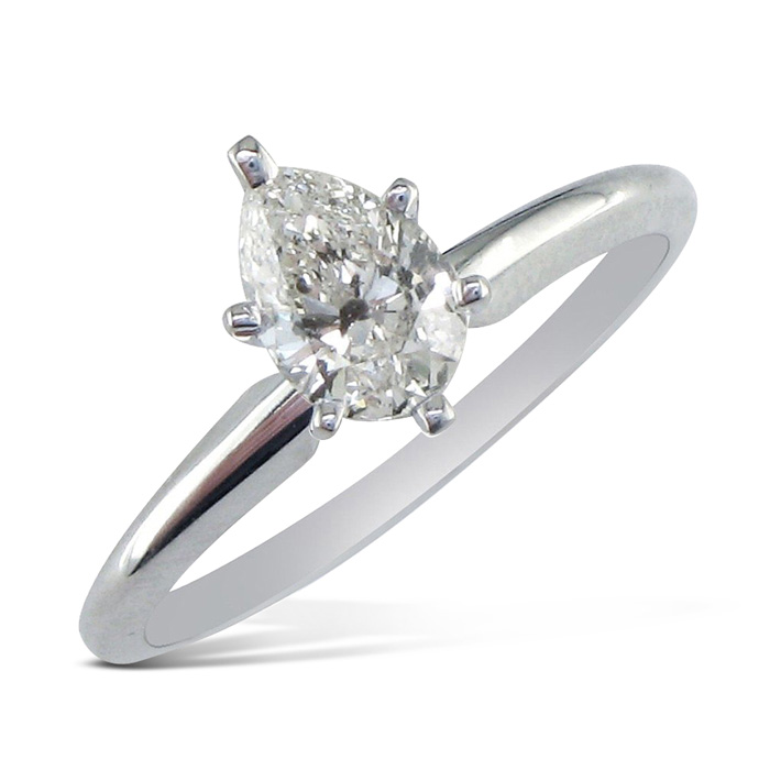 This classic solitaire ring features a 3/4 carat pear shape diamond in H-I color, SI2-I1 clarity. This ring is in 14 karat white gold.