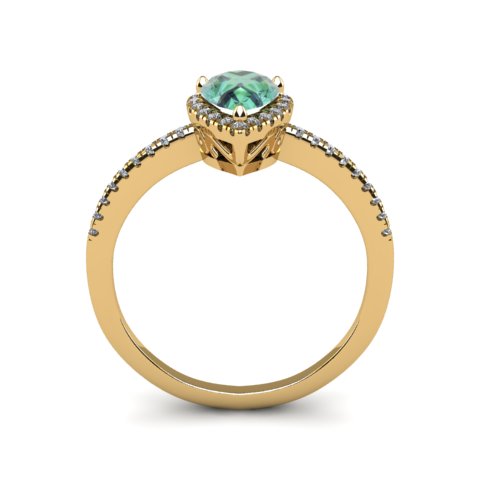 This stunning gemstone and halo diamond ring features one 7x5mm pear shape green amethyst gemstone at 0.60 carats. It is surrounded by 36 sparkling diamonds in a halo and down the band in I-J color, I1-I2 clarity at 0.18 carats. Total gem weight is 0.78 carats. This ring is crafted in 14 karat yellow gold.