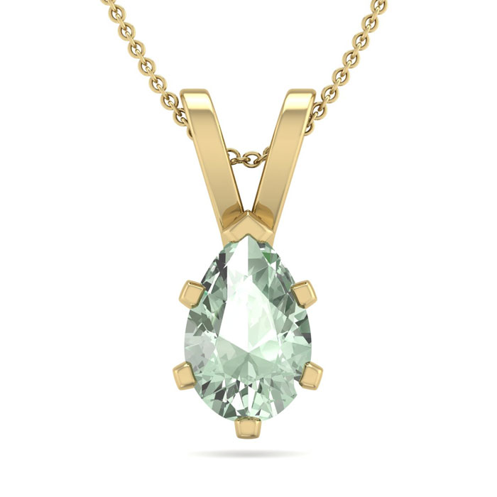 This classic necklace features one 7x4.5mm pear shape green amethyst gemstone. The stone weighs approximately 0.70 carats. This necklace is in 14 karat yellow gold over sterling silver and comes with an 18 inch cable chain with spring ring clasp.