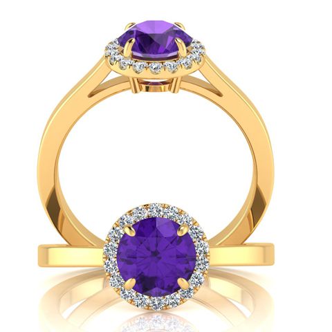 This stunning gemstone and halo diamond ring features one 6mm round shape amethyst gemstone at 0.75 carats. It is surrounded by 18 sparkling diamonds in a halo in H-I color, I1-I2 clarity at 0.09 carats. Total gem weight is 0.84 carats. This ring is crafted in 14 karat yellow gold.