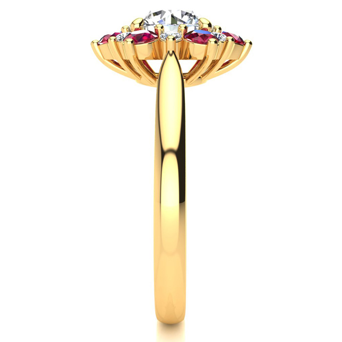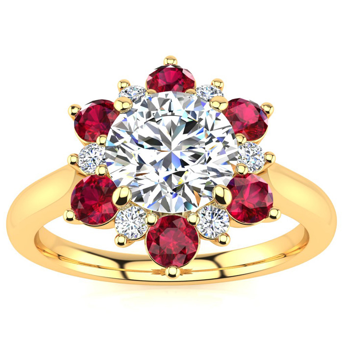 This ring features a clarity enhanced 1/2 carat round shape center diamond in I-J color. There are 6 sparkling side diamonds and 6 ruby gemstones in a halo in I1-I2 clarity at approximately 1/4 carat. Total gem weight is approximately 3/4 carat. This ring is in 14 karat yellow gold. Ring top measures 7x7mm.