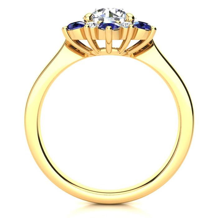 This ring features a 1/2 carat round shape center diamond in H-I color. There are 6 sparkling side diamonds and 6 sapphire gemstones in a halo in SI2-I1 clarity at approximately 1/4 carat. Total gem weight is approximately 3/4 carat. This ring is in 14 karat yellow gold. Ring top measures 7x7mm.