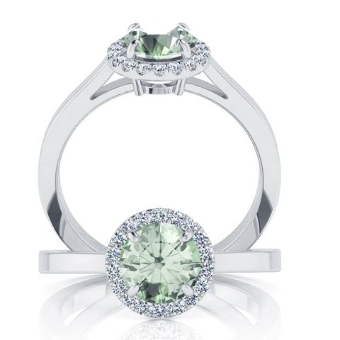 This stunning gemstone and halo diamond ring features one 6mm round shape green amethyst gemstone at 0.75 carats. It is surrounded by 18 sparkling diamonds in a halo in H-I color, I1-I2 clarity at 0.09 carats. Total gem weight is 0.84 carats. This ring is crafted in 14 karat white gold.