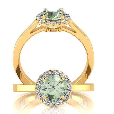 This stunning gemstone and halo diamond ring features one 6mm round shape green amethyst gemstone at 0.75 carats. It is surrounded by 18 sparkling diamonds in a halo in H-I color, I1-I2 clarity at 0.09 carats. Total gem weight is 0.84 carats. This ring is crafted in 14 karat yellow gold.