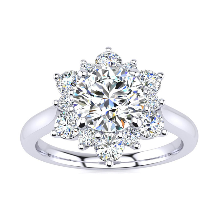 This ring features a 1/2 carat round shape center diamond in H-I color. There are 12 sparkling side diamonds in a halo in SI2-I1 clarity at approximately 1/4 carat. Total gem weight is approximately 3/4 carat. This ring is in 14 karat white gold. Ring top measures 7x7mm.